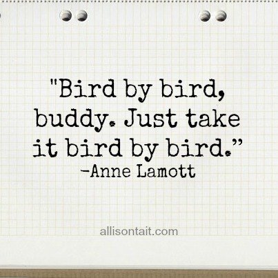 “Thirty years ago my older brother, who was ten years old at the time, was trying to get a report written on birds that he’d had three months to write, which was due the next day. We were out at our family cabin in Bolinas, and he was at the kitchen table close to tears, surrounded by binder paper and pencils and unopened books about birds, immobilized by the hugeness of the task ahead. Then my father sat down beside him put his arm around my brother’s shoulder, and said, “Bird by bird, buddy. Just take it bird by bird.”
